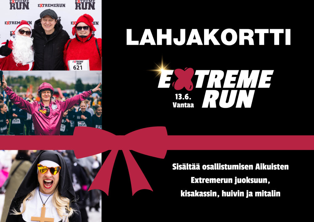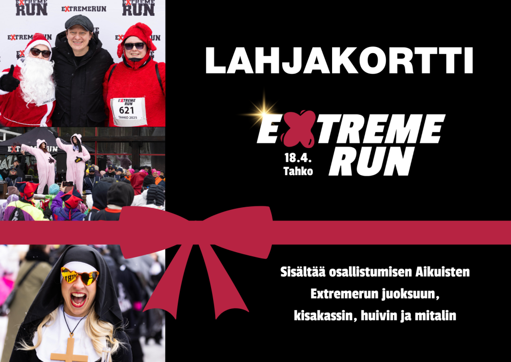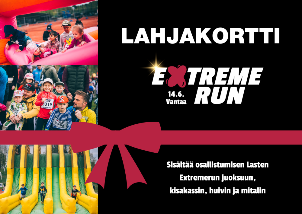 Yllätä ystävä, puoliso, kummi tai oma lapsesi elämyksellisellä Extremerun-lahjakortilla! NYT sekä lasten että aikuisten Extremerun-lahjakortit ovat saatavilla verkkokaupastamme. Lasten lahjakortti 25€ ja aikuisten lahjakortti 40€